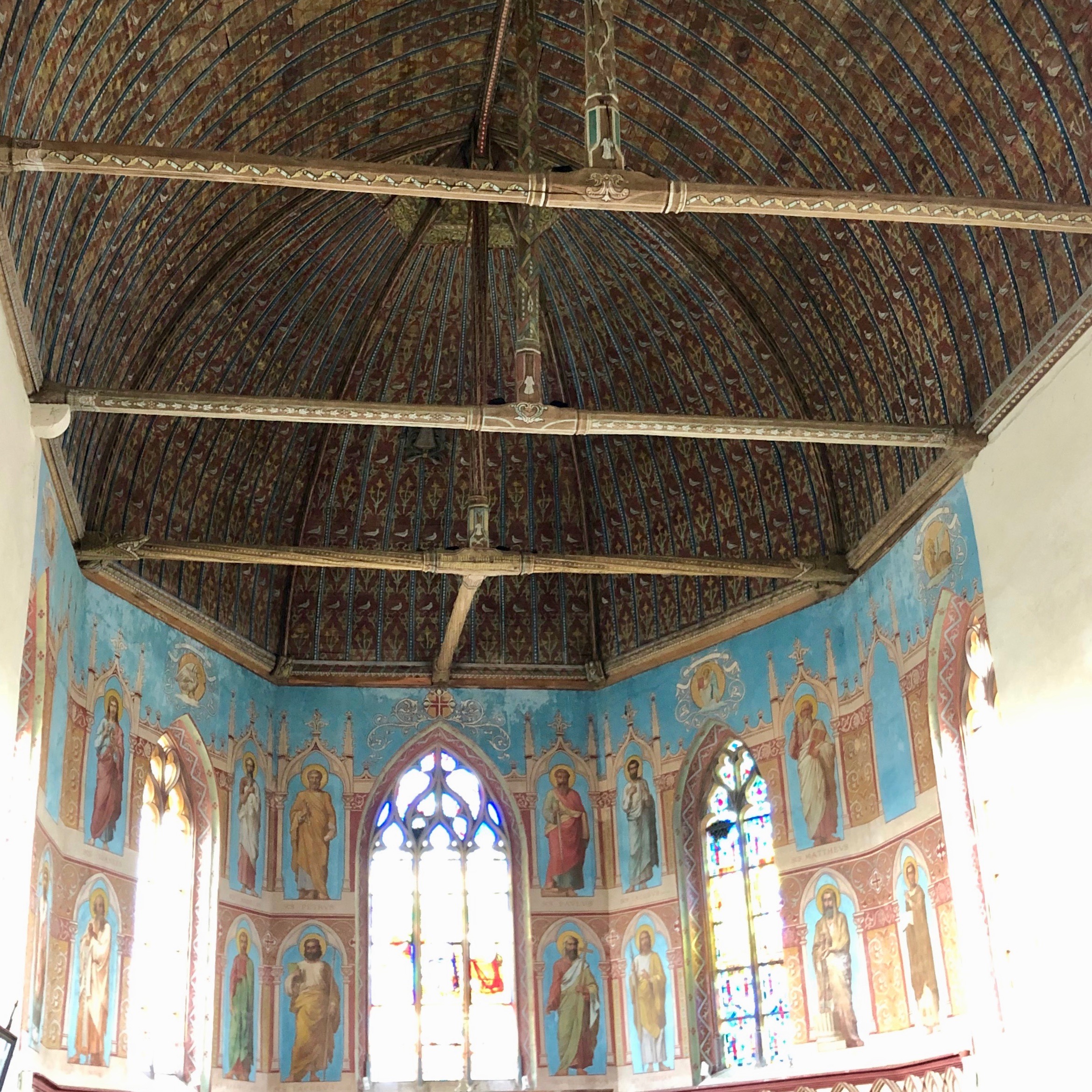L’entrée de l’église se fait par une impressionnante porte en bois à ferrures et à ouverture par clinche qui remonte à la construction d’origine. Et là, c’est la découverte de la très belle voûte aux décors polychromes et des éléments de charpente peints.